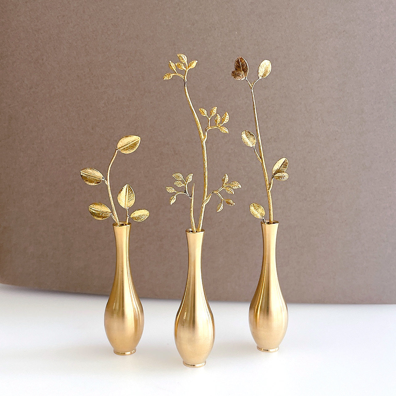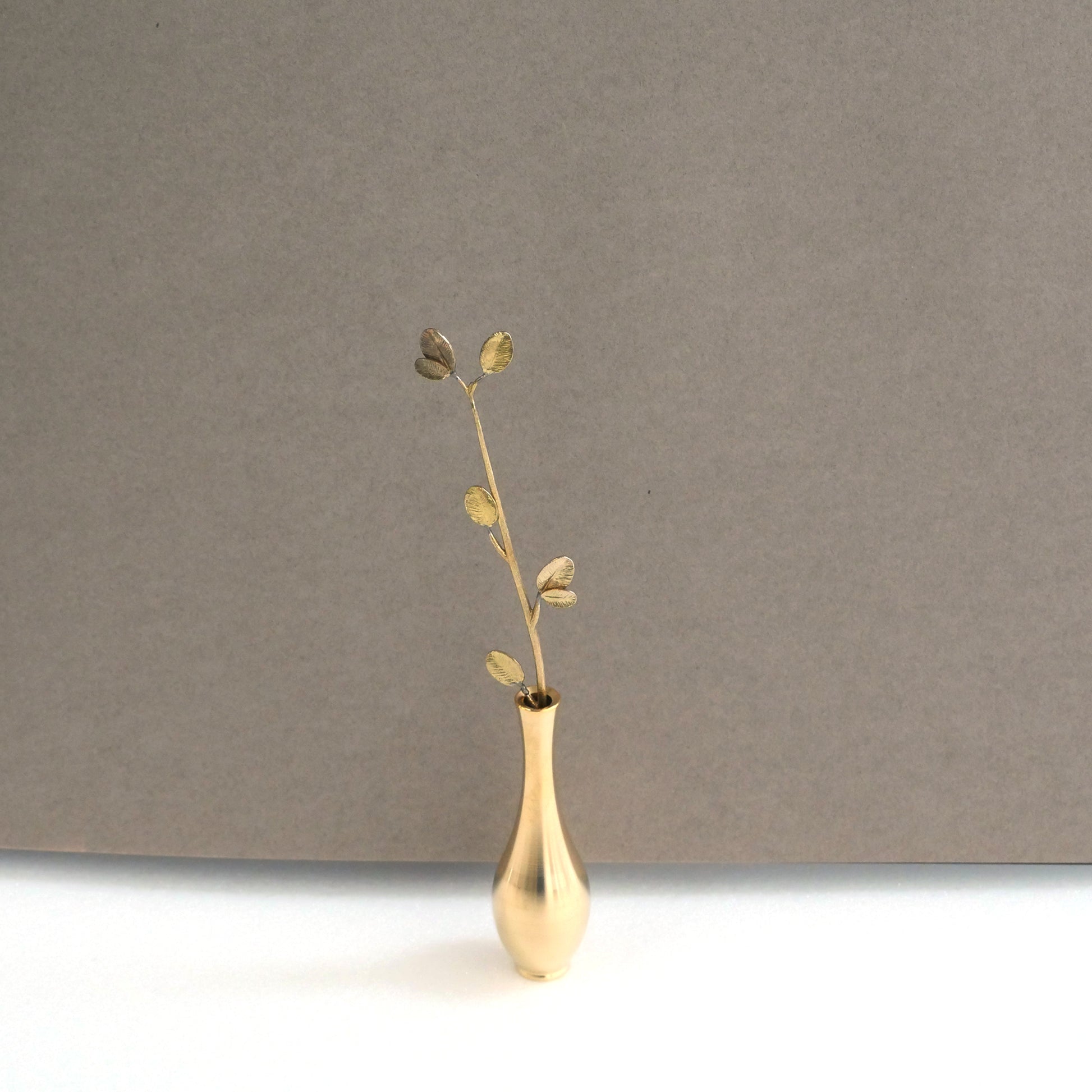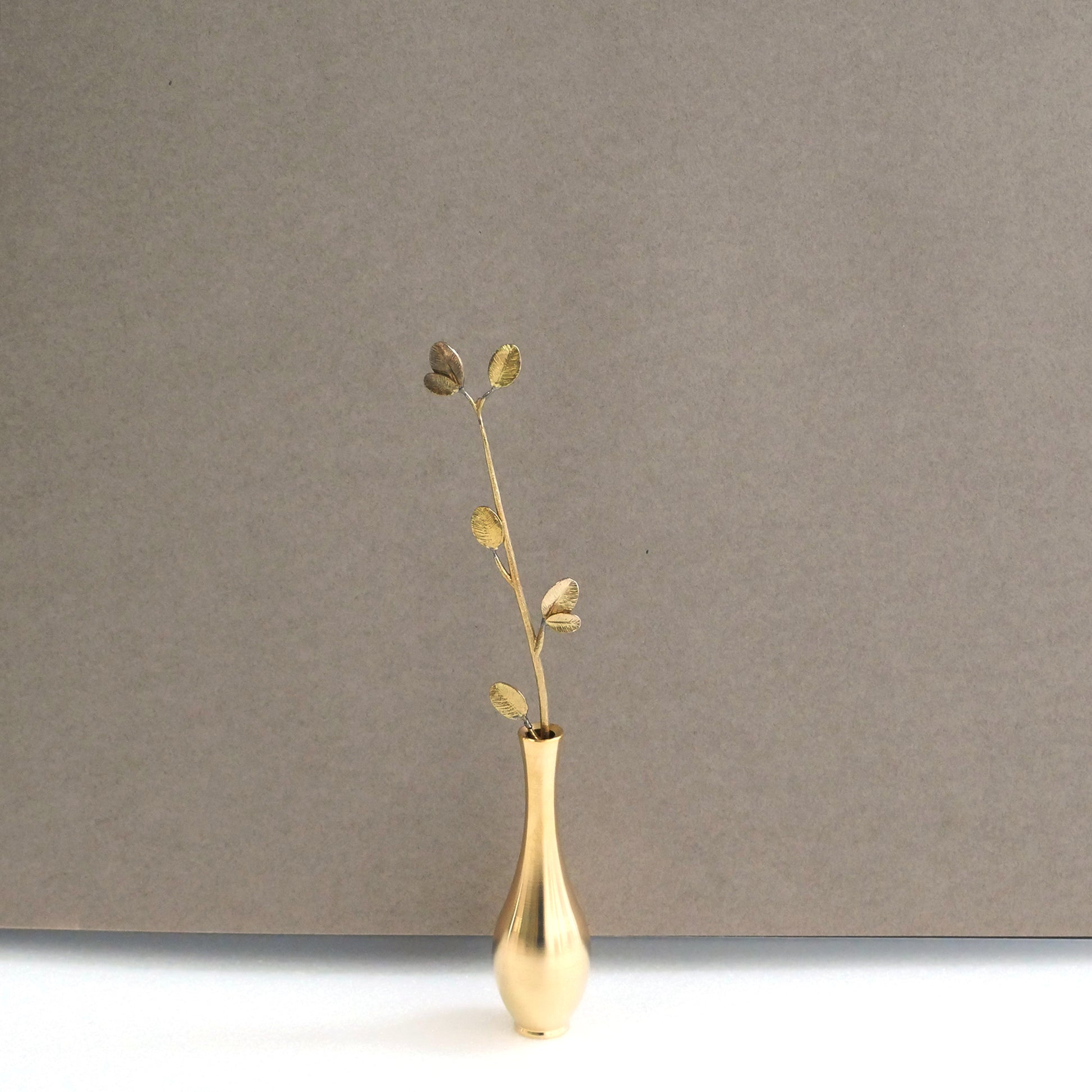 無垢の真鍮を用い、時間の経過とともに深みを増す風合いを楽しめる花瓶。 光をやわらかく反射する滑らかな表面は、素材そのものの美しさを引き出しています。 手のひらに収まる小ぶりなサイズで、デスクや棚、玄関などの小さな空間にも調和します。