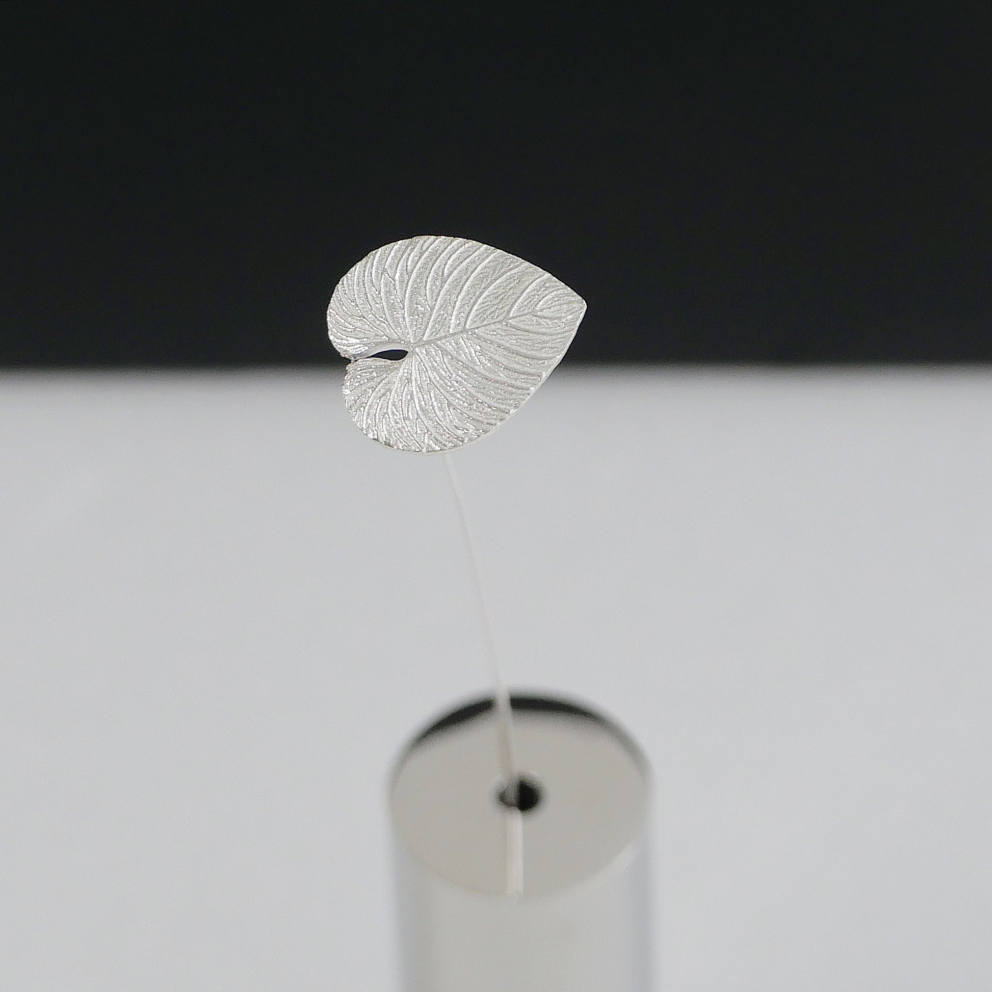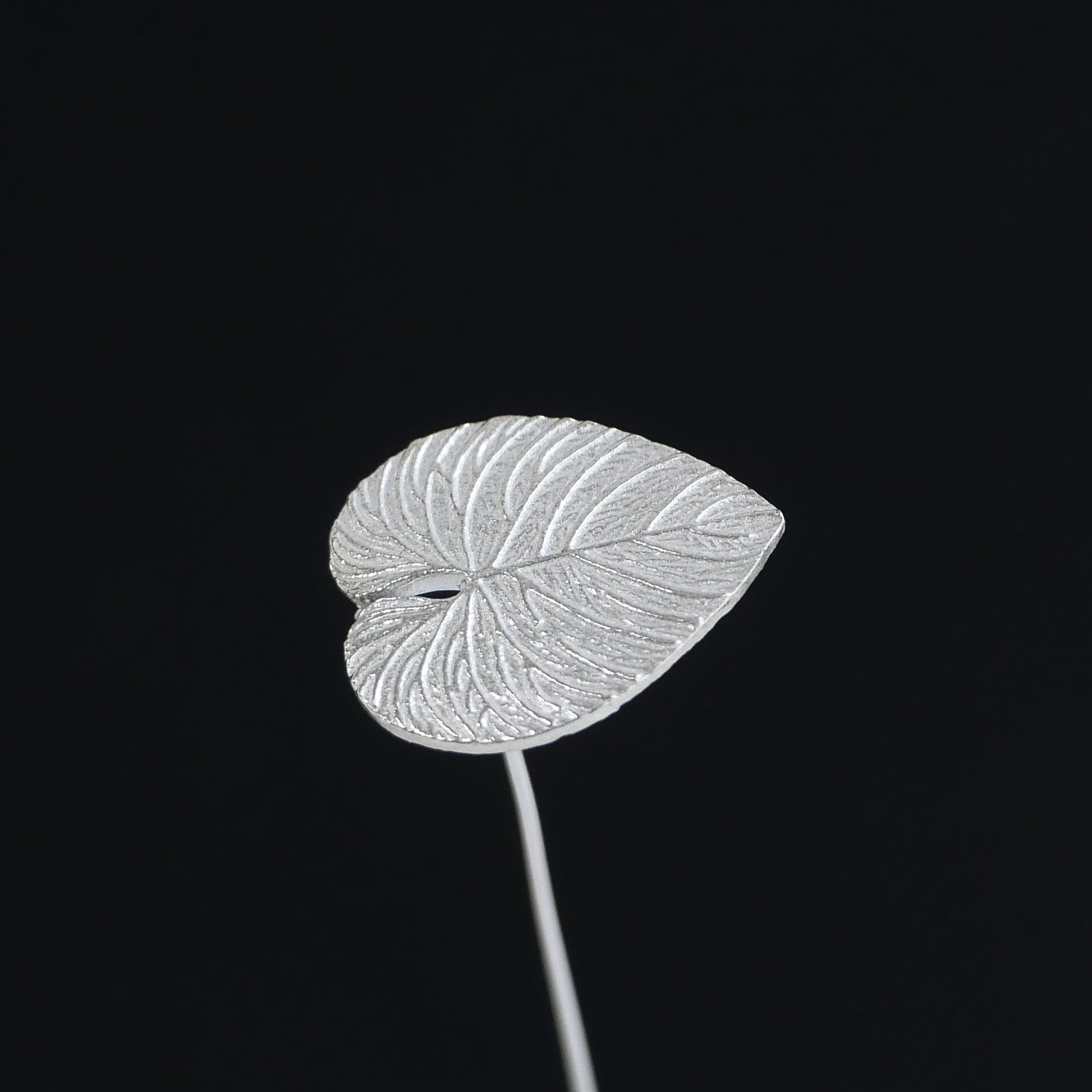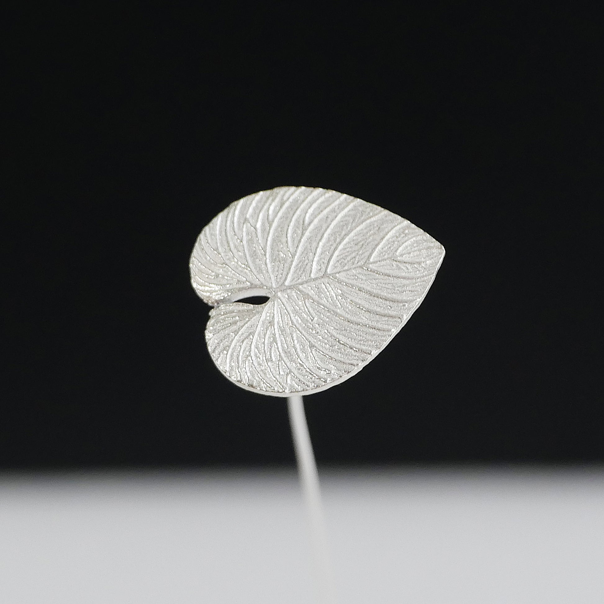 繊細に刻まれた葉脈が光を受けて微細に輝き、金属でありながら自然のぬくもりを感じさせる佇まいです。