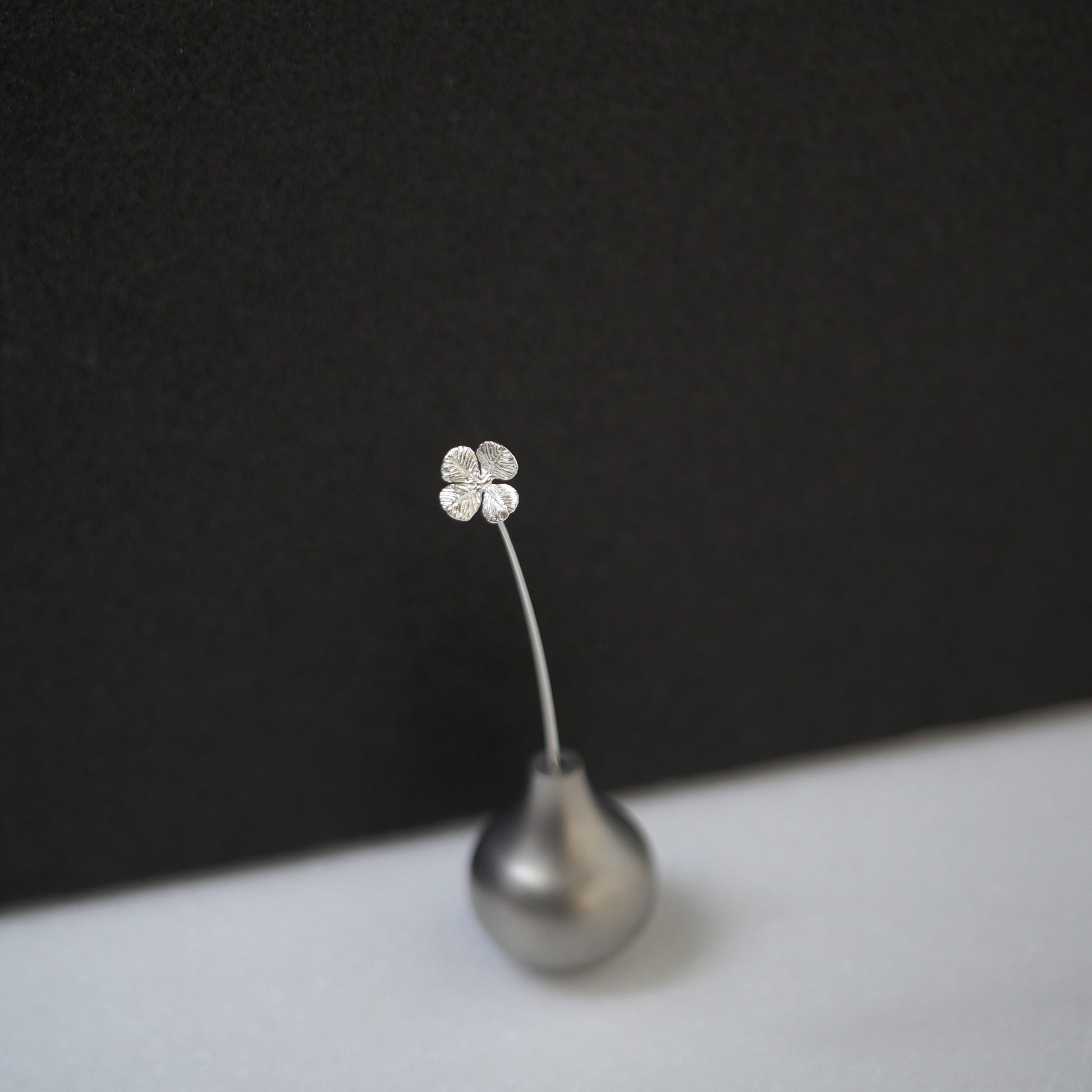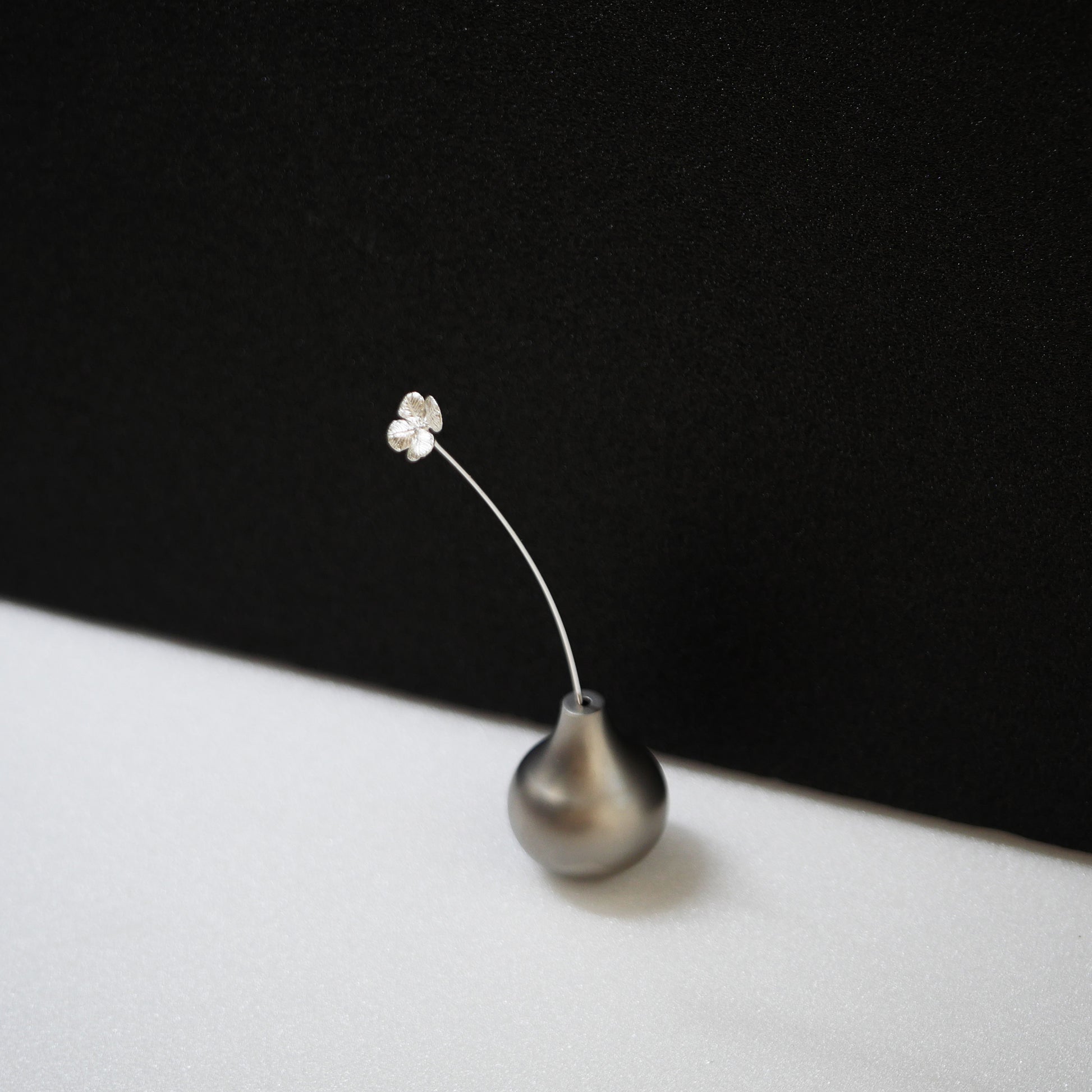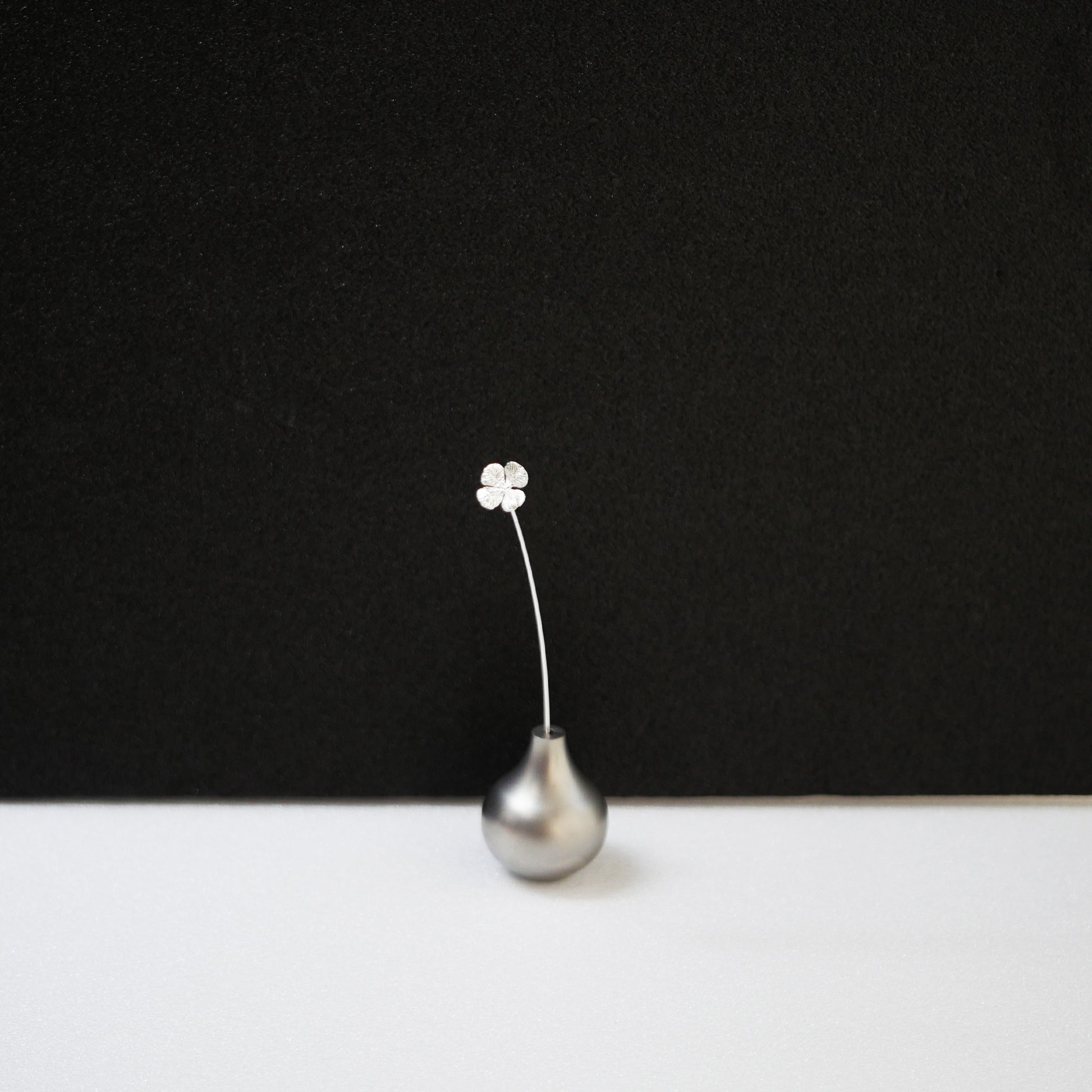シルバー925で繊細に表現された四つ葉のクローバーモチーフのミニ一輪挿し。小さなフォルムながらも銀の上品な輝きが花の美しさを引き立て、空間に可憐な彩りを添えます。「幸運」の象徴であるクローバーは、大切な方への贈り物にも最適な特別感のあるオブジェです。