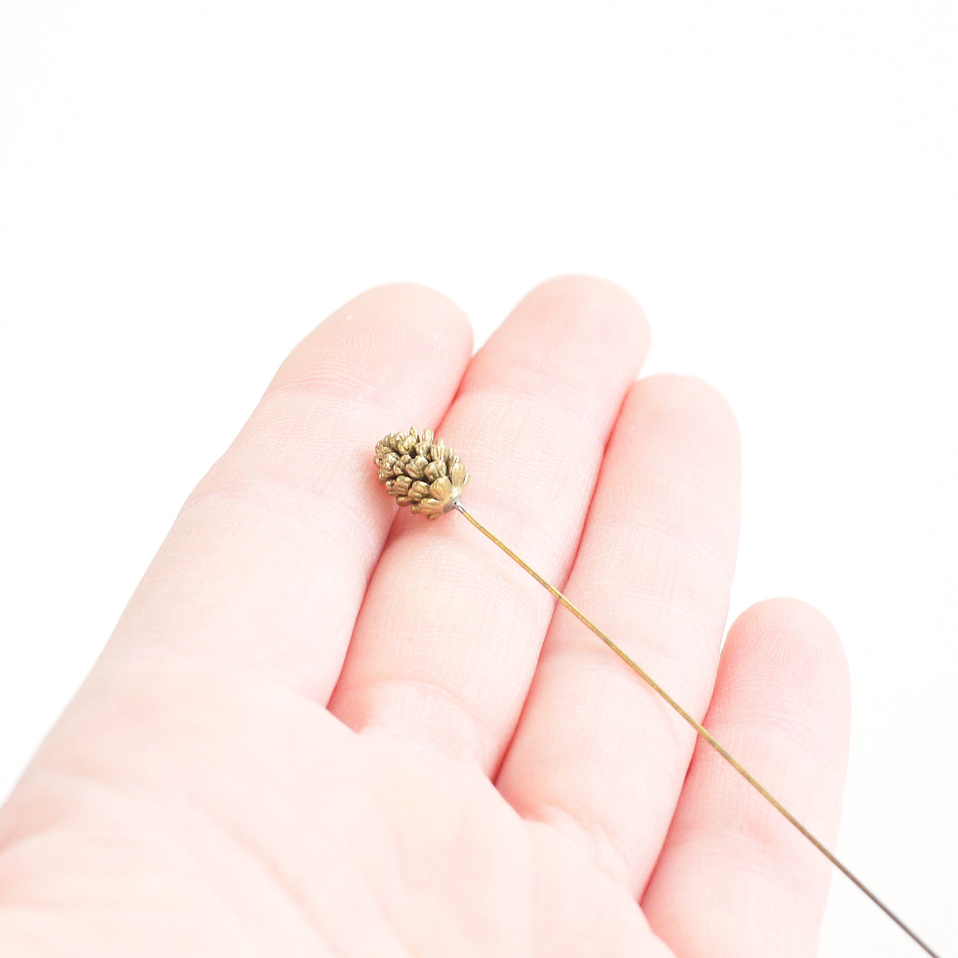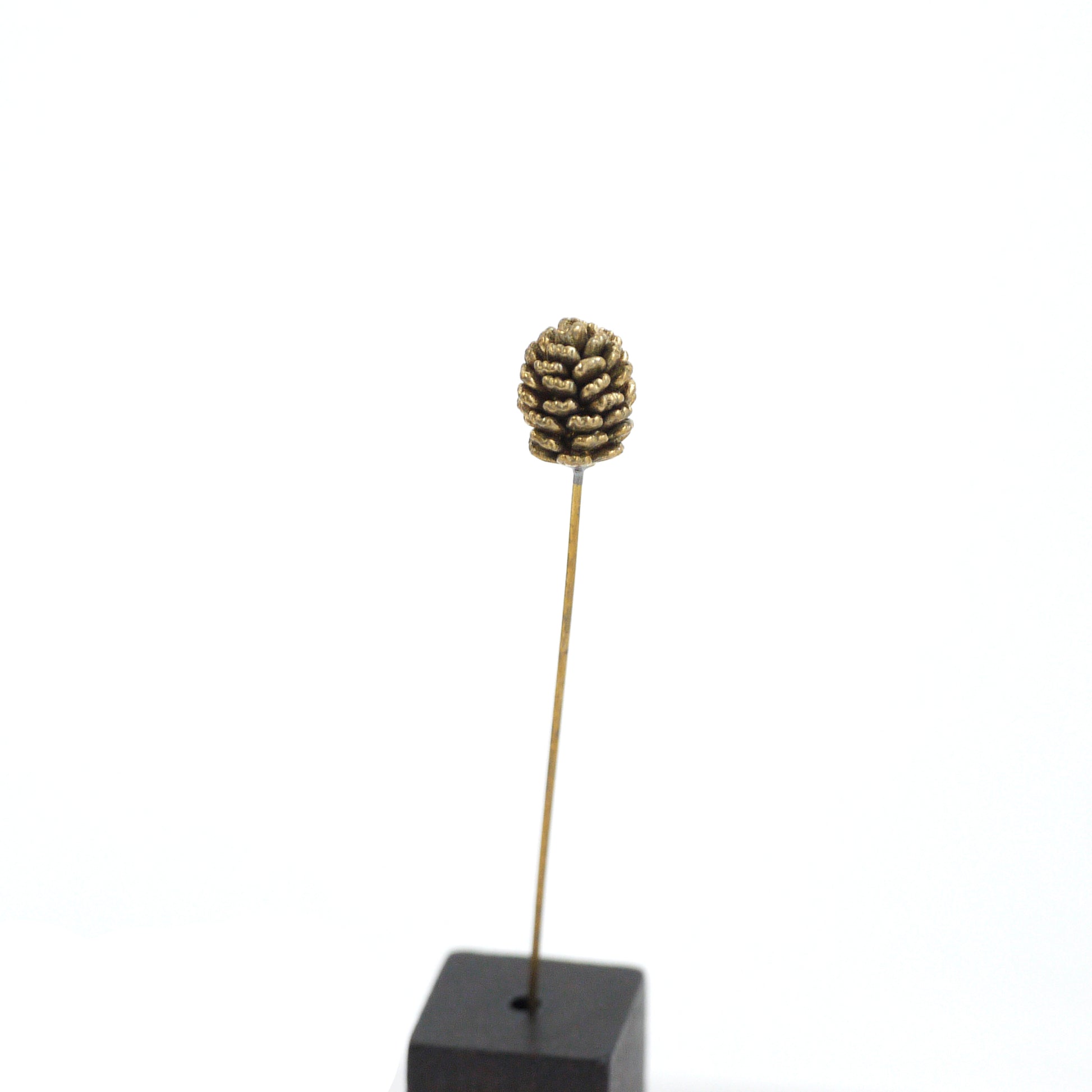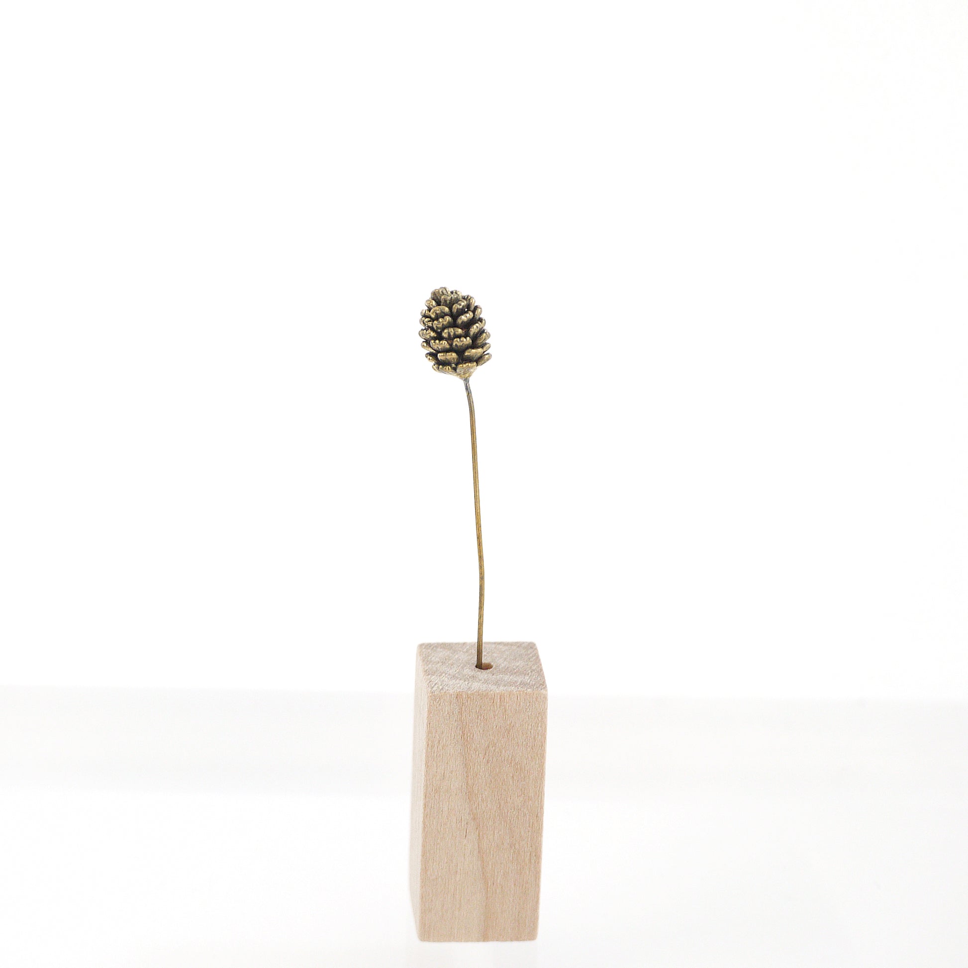 森の中で静かに佇む小さな松ぼっくりを、真鍮の繊細な表現でかたどった一輪挿しオブジェです。幾重にも重なる鱗片の立体感を忠実に再現し、経年とともに深まる真鍮ならではの風合いを楽しめます。木製の花瓶と組み合わせることで、素朴でありながら上質な存在感に。窓辺や机にそっと置くだけで、暮らしの中に森の気配を添えてくれます。 単品としても、複数を並べても絵になるデザインで、贈り物にもふさわしい一品です。